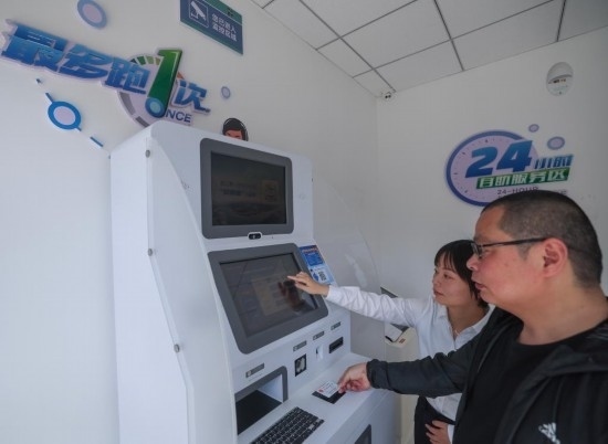 2024年5月9日,在浙江省嘉興市秀洲區(qū)王江涇鎮(zhèn)便民服務(wù)中心,工作人員指導(dǎo)居民對(duì)在蘇州工作期間的社保繳費(fèi)記錄進(jìn)行自助跨省查詢。新華社記者 徐昱 攝
