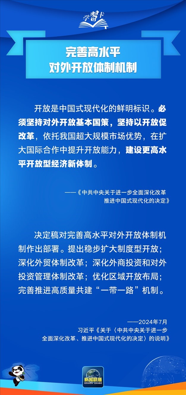 今年7月,黨的二十屆三中全會審議通過《中共中央關于進一步全面深化改革 推進中國式現(xiàn)代化的決定》。這份綱領性文件明確提出,“完善高水平對外開放體制機制”。