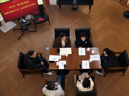2023年2月17日,上海市長寧區(qū)虹橋街道古北市民中心主任盛弘和居民代表討論社區(qū)服務(wù)功能的相關(guān)議題。新華社記者 劉穎 攝