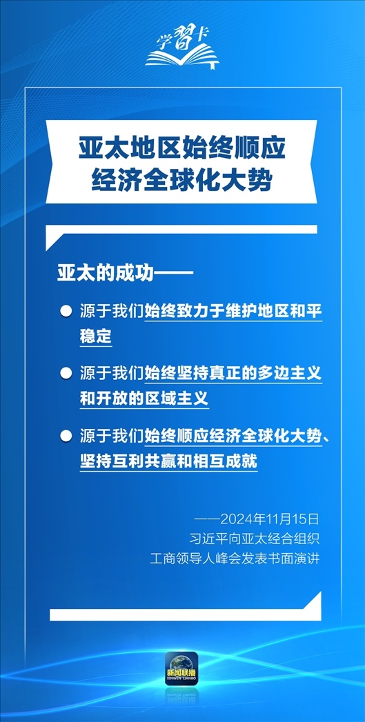 習(xí)近平指出,過去30年,亞太地區(qū)經(jīng)濟(jì)保持了強(qiáng)勁增長,創(chuàng)造了舉世矚目的“亞太奇跡”。如何推動構(gòu)建亞太命運(yùn)共同體,打造亞太發(fā)展的下一個“黃金三十年”?習(xí)主席強(qiáng)調(diào)了一個關(guān)鍵詞:經(jīng)濟(jì)全球化。一起學(xué)習(xí)↓