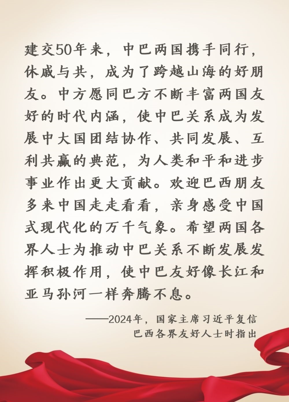 2023年4月,習(xí)近平主席同來華進(jìn)行國(guó)事訪問的巴西總統(tǒng)盧拉舉行會(huì)談時(shí),談到雙方要以2024年慶祝建交50周年為契機(jī),繼續(xù)推動(dòng)中巴友好。