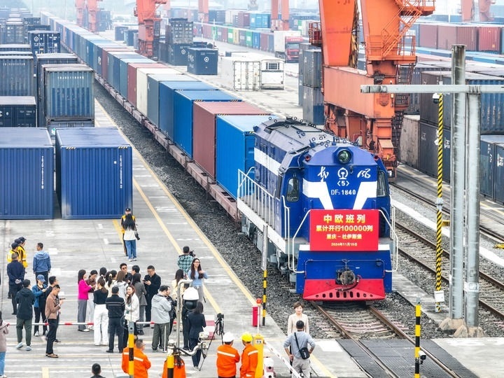 11月15日上午10時20分,重慶團(tuán)結(jié)村中心站。隨著X8083次中歐班列(重慶—杜伊斯堡)從站臺緩緩駛出,中歐班列累計開行突破10萬列。
