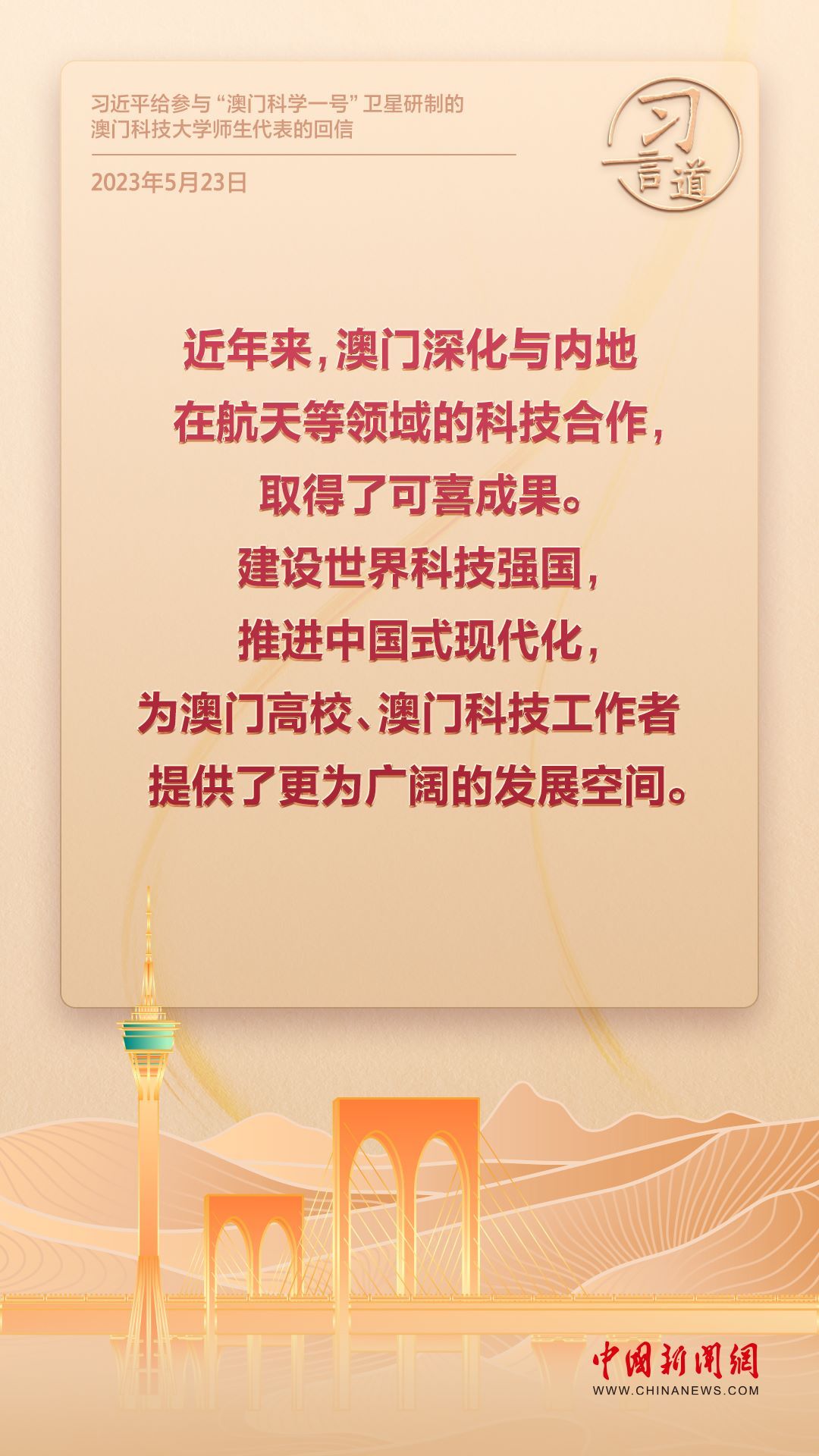 2024年是澳門回歸祖國(guó)25周年。多年來(lái),習(xí)近平主席始終關(guān)注澳門經(jīng)濟(jì)社會(huì)發(fā)展、百姓福祉,寄語(yǔ)“澳門的發(fā)展厚積薄發(fā)、未來(lái)可期”。