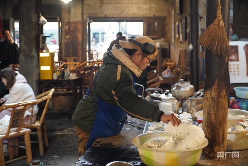 李強正戴著藍布圍裙,在茶館里忙碌(央廣網(wǎng)記者 昌思榮 攝)