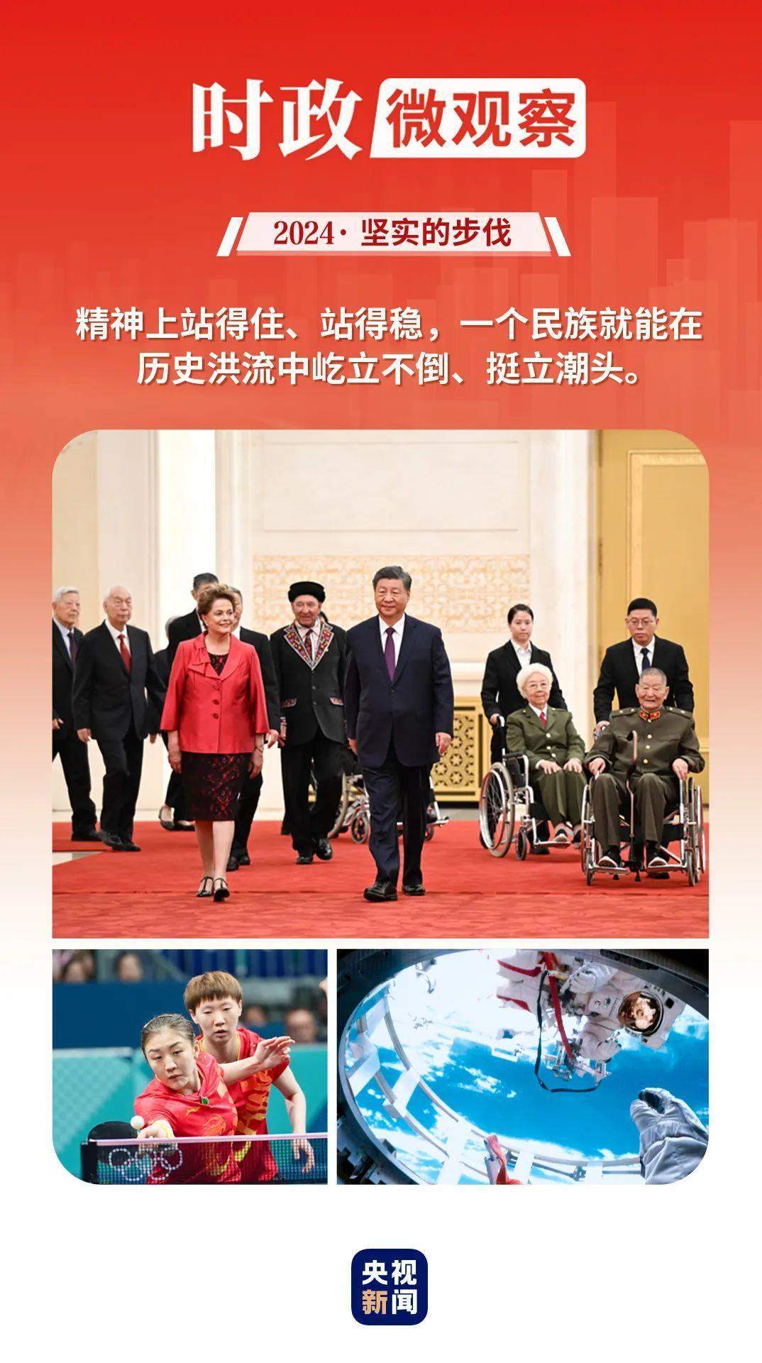 回望2024年,黨的二十屆三中全會(huì)標(biāo)記下改革開(kāi)放進(jìn)程又一重要?dú)v史性時(shí)刻;我們熱烈慶祝中華人民共和國(guó)成立75周年 、澳門(mén)回歸祖國(guó)25周年,匯聚砥礪前行的強(qiáng)大力量;中國(guó)體育代表團(tuán)取得夏季奧運(yùn)會(huì)境外參賽最好成績(jī),生動(dòng)詮釋了新時(shí)代中國(guó)精神;太空遨游、智能迭代、長(zhǎng)橋飛渡、巨輪啟航,中國(guó)的創(chuàng)新動(dòng)力、發(fā)展活力勃發(fā)奔涌……中國(guó)人民更加自信自強(qiáng),奮斗精神更加昂揚(yáng)。