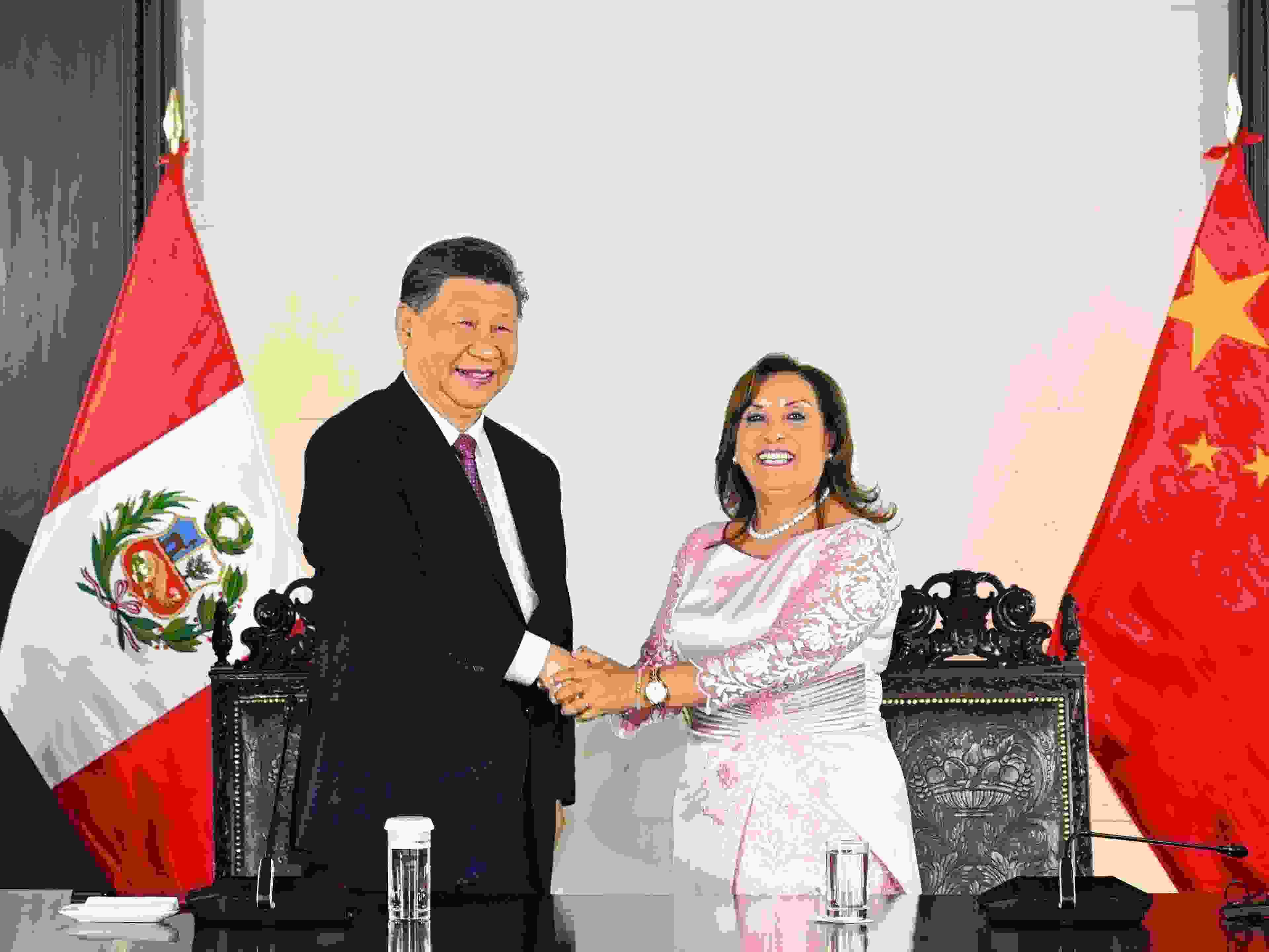 當?shù)貢r間2024年11月14日晚,國家主席習(xí)近平同秘魯總統(tǒng)博魯阿爾特在利馬總統(tǒng)府以視頻方式共同出席錢凱港開港儀式。新華社記者 謝環(huán)馳 攝