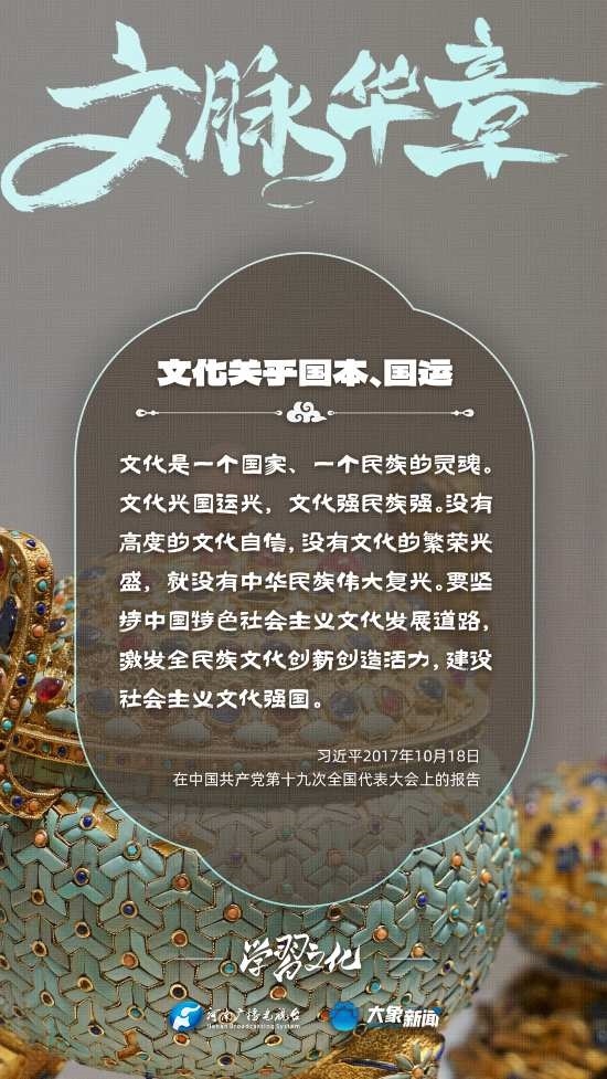 習近平總書記高度重視文化之于國家、之于民族的重大意義,強調:文化是一個國家、一個民族的靈魂。文化興國運興,文化強民族強。沒有高度的文化自信,沒有文化的繁榮興盛,就沒有中華民族偉大復興。大象新聞梳理了習近平總書記的系列重要論述,我們一起學習。