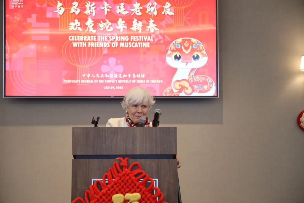 美國艾奧瓦州小城馬斯卡廷,當(dāng)?shù)貢r(shí)間農(nóng)歷蛇年初一。明媚陽光照耀下,在梅里爾酒店六層,一場特別的新春聚會正在舉行。福字、窗花、中國結(jié),“中國紅”裝點(diǎn)著喜慶祥和的氛圍。中美友人歡聚一堂,沉浸在歡聲笑語中。