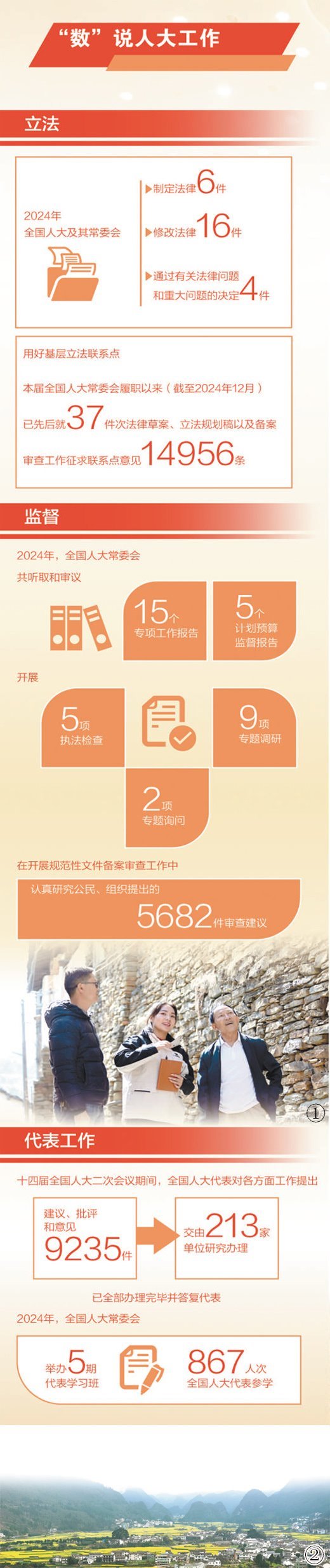 這一年,全國(guó)人大及其常委會(huì)認(rèn)真行使憲法法律賦予的立法權(quán),加強(qiáng)重點(diǎn)領(lǐng)域、新興領(lǐng)域、涉外領(lǐng)域立法,深入推進(jìn)科學(xué)立法、民主立法、依法立法,不斷完善以憲法為核心的中國(guó)特色社會(huì)主義法律體系,2024年全國(guó)人大及其常委會(huì)制定法律6件,修改法律16件,通過有關(guān)法律問題和重大問題的決定4件。