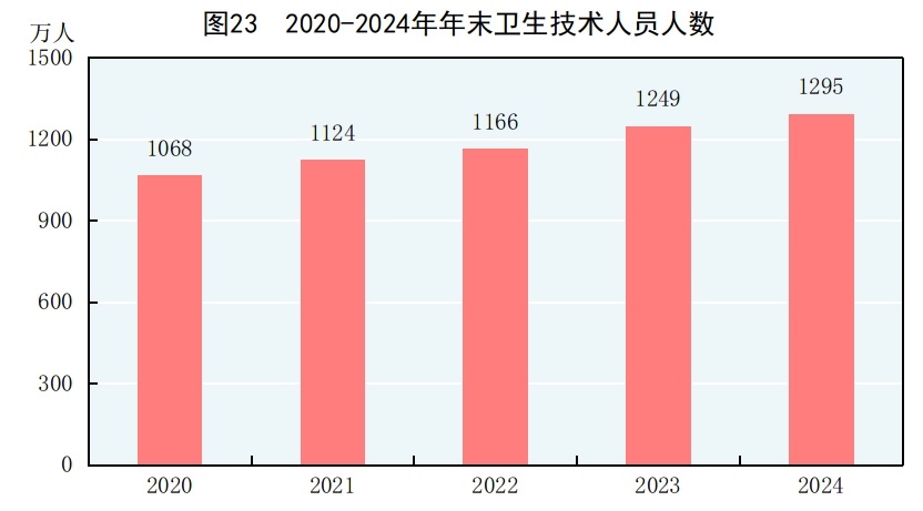 年末全國(guó)共有醫(yī)療衛(wèi)生機(jī)構(gòu)109.2萬(wàn)個(gè),其中醫(yī)院3.9萬(wàn)個(gè),在醫(yī)院中有公立醫(yī)院1.2萬(wàn)個(gè),民營(yíng)醫(yī)院2.7萬(wàn)個(gè);基層醫(yī)療衛(wèi)生機(jī)構(gòu)104.0萬(wàn)個(gè),其中鄉(xiāng)鎮(zhèn)衛(wèi)生院3.3萬(wàn)個(gè),社區(qū)衛(wèi)生服務(wù)中心(站)3.7萬(wàn)個(gè),門診部(所)39.8萬(wàn)個(gè),村衛(wèi)生室57.1萬(wàn)個(gè);專業(yè)公共衛(wèi)生機(jī)構(gòu)9217個(gè)(不含衛(wèi)生監(jiān)督所、中心),其中疾病預(yù)防控制中心3429個(gè)。衛(wèi)生技術(shù)人員1295萬(wàn)人,其中執(zhí)業(yè)醫(yī)師和執(zhí)業(yè)助理醫(yī)師505萬(wàn)人,注冊(cè)護(hù)士584萬(wàn)人。醫(yī)療衛(wèi)生機(jī)構(gòu)床位1037萬(wàn)張,其中醫(yī)院818萬(wàn)張,鄉(xiāng)鎮(zhèn)衛(wèi)生院151萬(wàn)張。全年總診療人次[79]101.1億人次,出院人次[80]3.1億人次。