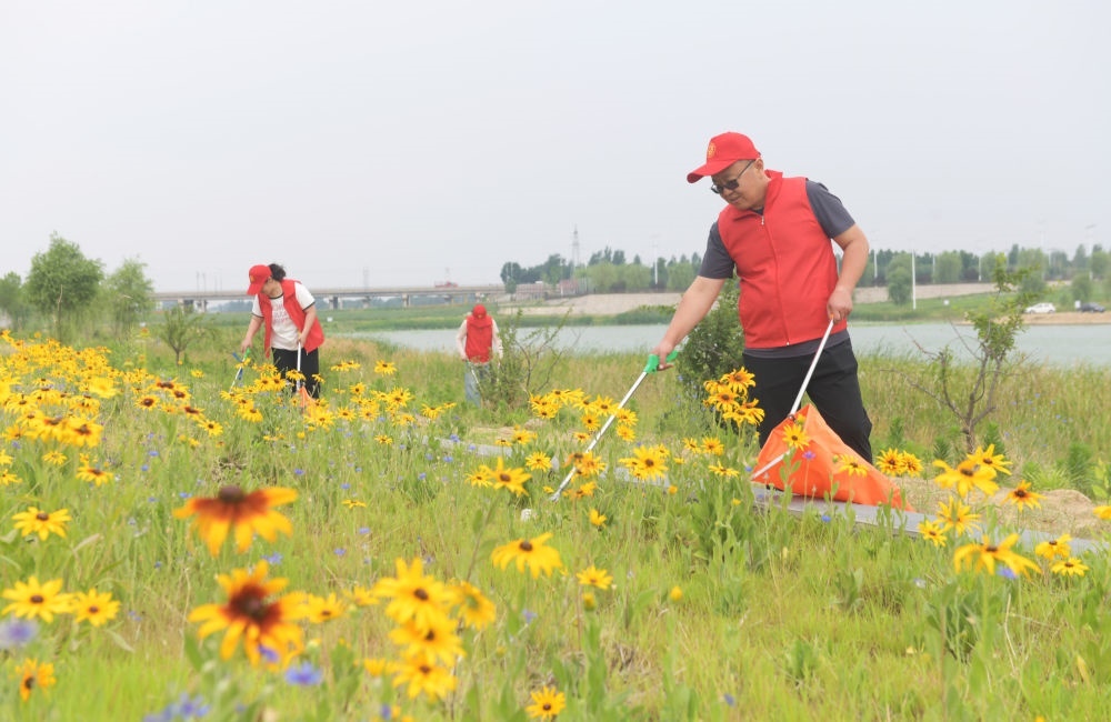 2024年6月5日,環(huán)保志愿者在河北省石家莊新樂市磁河木刀溝生態(tài)濕地?fù)焓袄?/span>