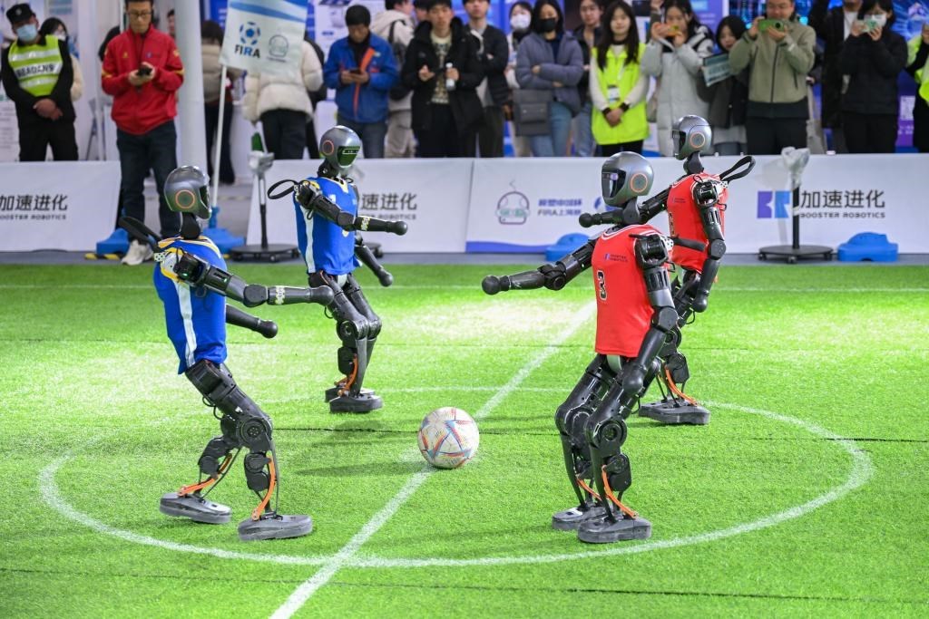 2月21日,機器人在2025全球開發(fā)者先鋒大會現(xiàn)場踢足球。 新華社發(fā)(陳浩明 攝)