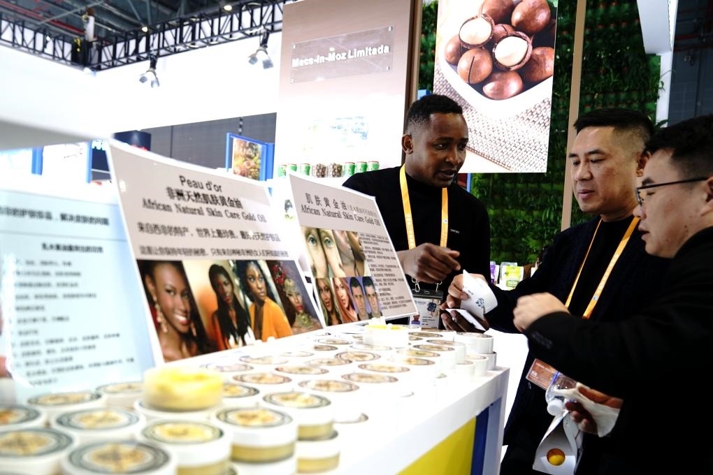 2024年11月7日,參展商在第七屆進博會食品及農(nóng)產(chǎn)品展區(qū)的非洲產(chǎn)品專區(qū)介紹產(chǎn)品。新華社記者 張建松 攝