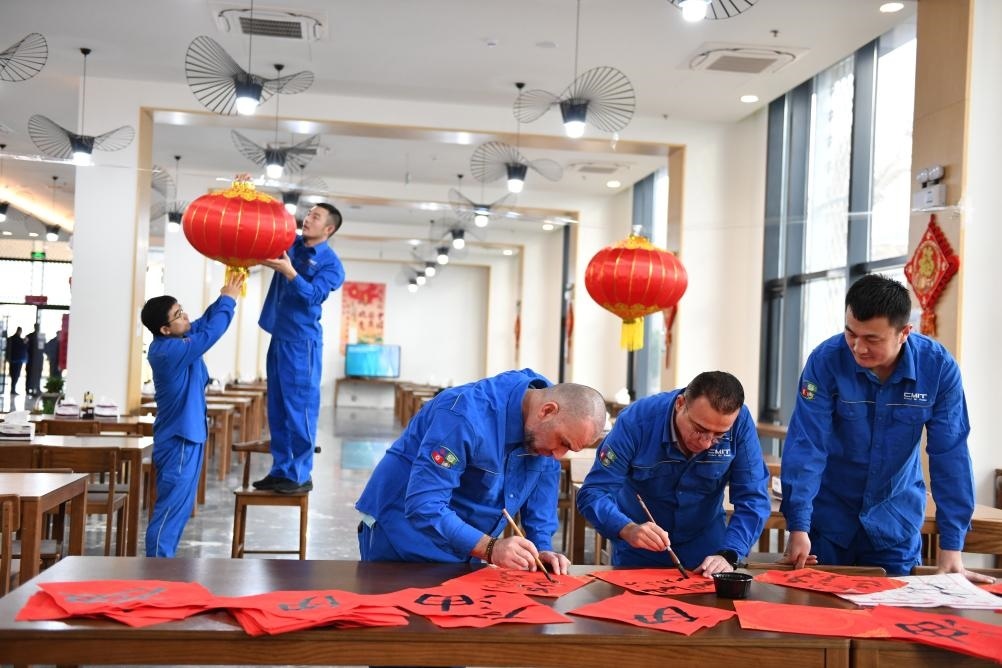1月23日,在伊拉克米桑油田,中海石油伊拉克有限公司中外員工一起寫春聯(lián),掛燈籠。新華社發(fā)