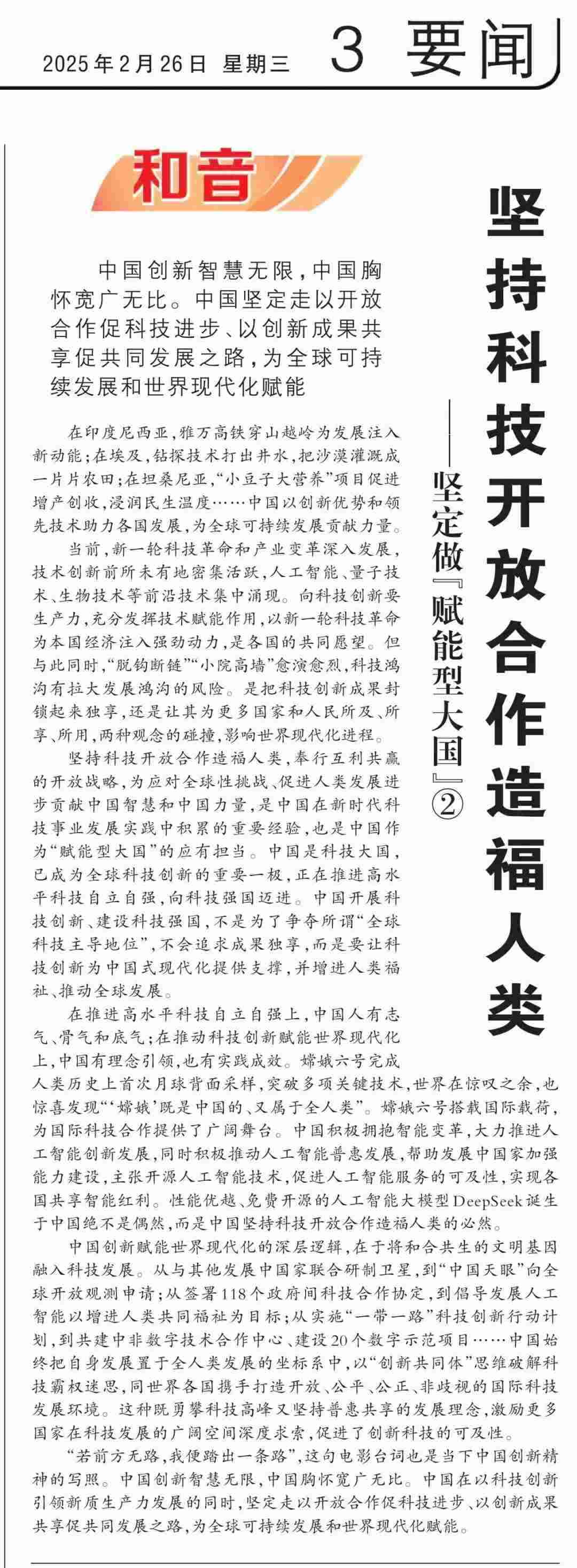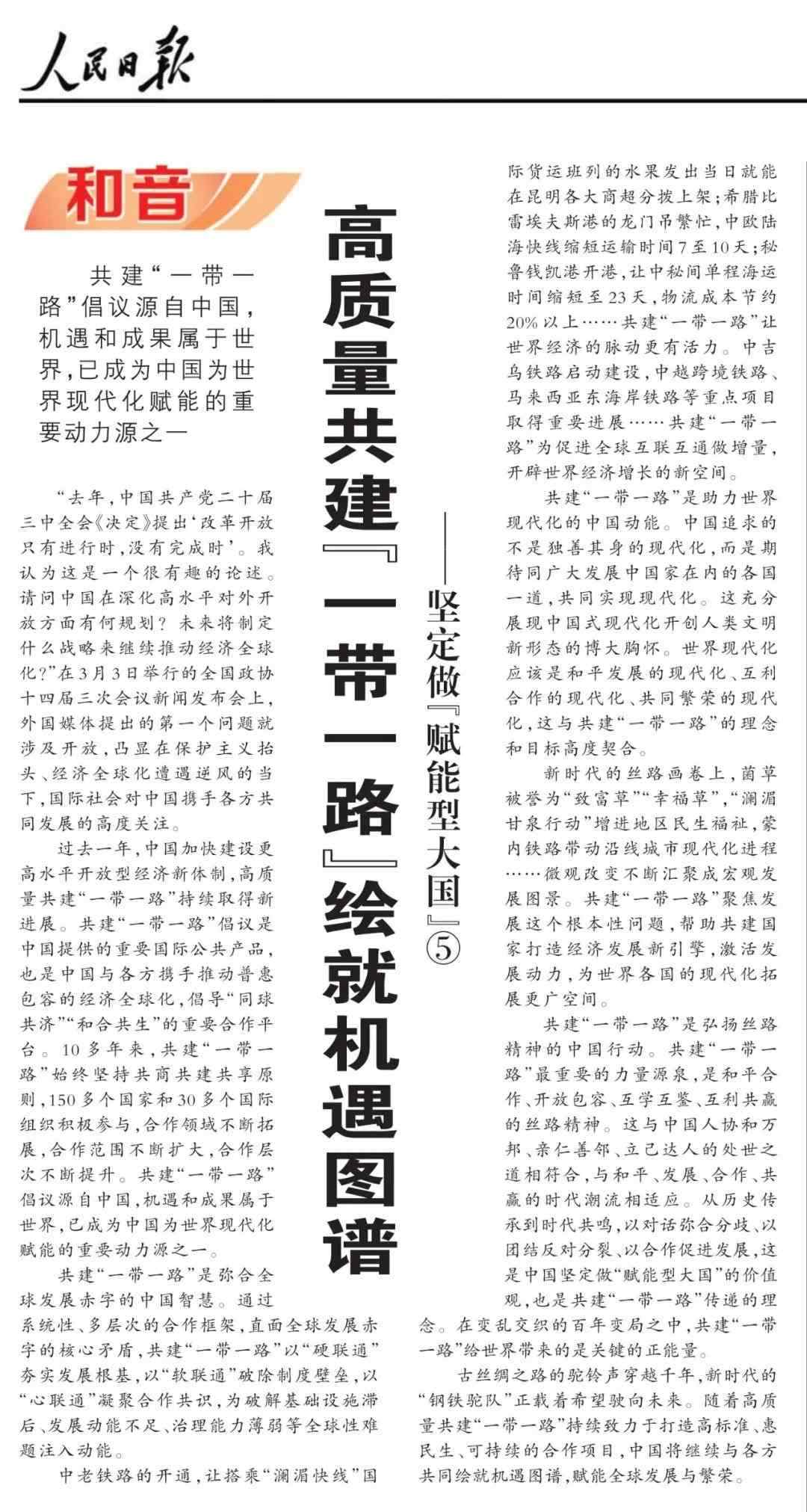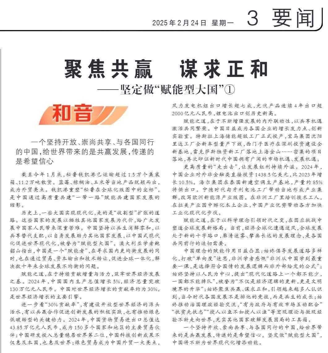 近期,《人民日?qǐng)?bào)》“和音”欄目推出“堅(jiān)定做‘賦能型大國(guó)’”系列評(píng)論,圍繞科技創(chuàng)新、開放共贏、綠色轉(zhuǎn)型、高質(zhì)量共建“一帶一路”、多邊治理等熱點(diǎn)議題,從不同角度闡釋中國(guó)何以成為一個(gè)“賦能型大國(guó)”的深層邏輯,展現(xiàn)中國(guó)始終秉持構(gòu)建人類命運(yùn)共同體理念,不斷以中國(guó)式現(xiàn)代化為世界現(xiàn)代化賦能的大國(guó)擔(dān)當(dāng)。