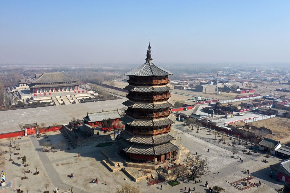 位于山西朔州市的應縣木塔建于遼代清寧二年(1056年),塔高67.31米,上下連接的全部架構(gòu)均由卯榫咬合而成,是世界上現(xiàn)存最古老、最高大的純木結(jié)構(gòu)建筑(2025年3月7日攝,無人機照片)。