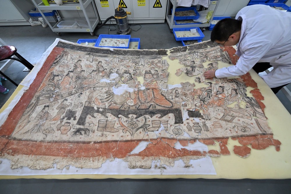 2024年2月27日,云岡研究院壁畫文物修復室工作人員王建國在修復壁畫。