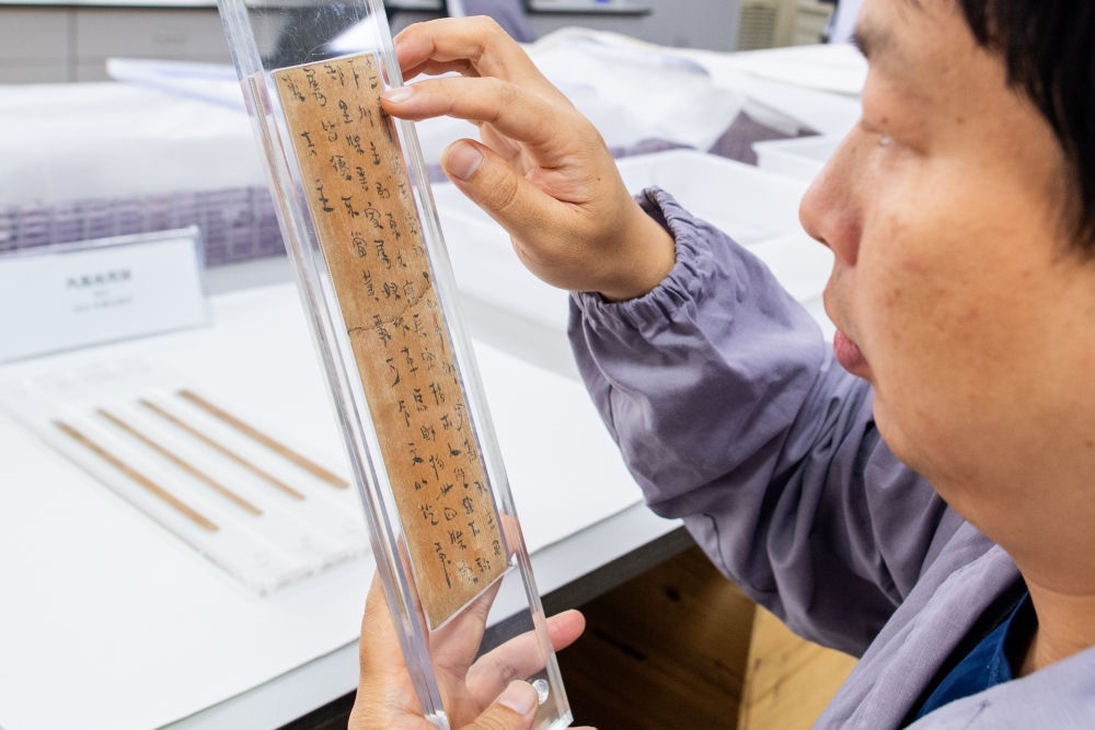 2023年5月20日,湖北荊州文物保護(hù)中心的修復(fù)人員史少華在查看修復(fù)完成的簡(jiǎn)牘。荊州文物保護(hù)中心是我國(guó)簡(jiǎn)牘修復(fù)領(lǐng)域?qū)嵙ψ顝?qiáng)的機(jī)構(gòu)之一,近年來(lái)累計(jì)完成13萬(wàn)多枚竹木簡(jiǎn)牘的脫水工作,飽水簡(jiǎn)牘修復(fù)量占全國(guó)90%以上。
