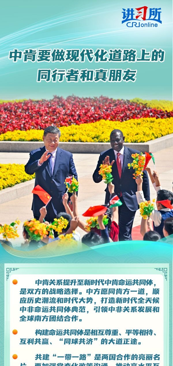 4月24日,中國國家主席習近平同肯尼亞總統(tǒng)魯托在北京舉行會談,兩國元首一致同意將雙邊關(guān)系定位提升至新時代中肯命運共同體。習近平表示,構(gòu)建命運共同體是相互尊重、平等相待、互利共贏、“同球共濟”的大道正途。中肯雙方要做現(xiàn)代化道路上的同行者和真朋友。
