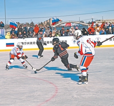 2月22日至23日,2025中俄國際冬季體育系列比賽在中國黑河市和俄羅斯布拉戈維申斯克市之間的黑龍江江面上舉行。圖為中俄少年組冰球隊(duì)員在賽場上激烈角逐。