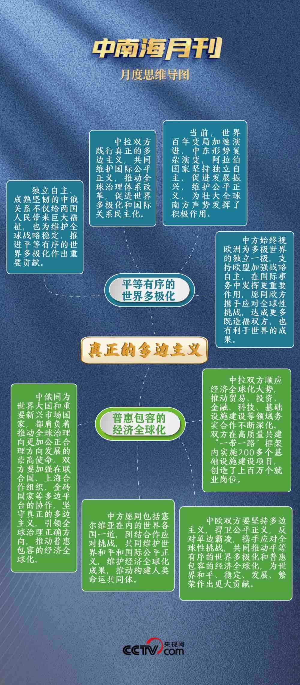 面對單邊主義逆流,堅定不移推動平等有序的世界多極化。不為一時一事所惑,不為風高浪急所擾,與俄方達成“共同弘揚正確二戰(zhàn)史觀,維護聯(lián)合國權威和地位,維護國際公平正義”的共識;與歐盟“深化戰(zhàn)略溝通,增進理解互信,鞏固伙伴定位”;同拉方攜手啟動團結、發(fā)展等五大工程,推動中國同全球南方國家相互支持、團結合作。