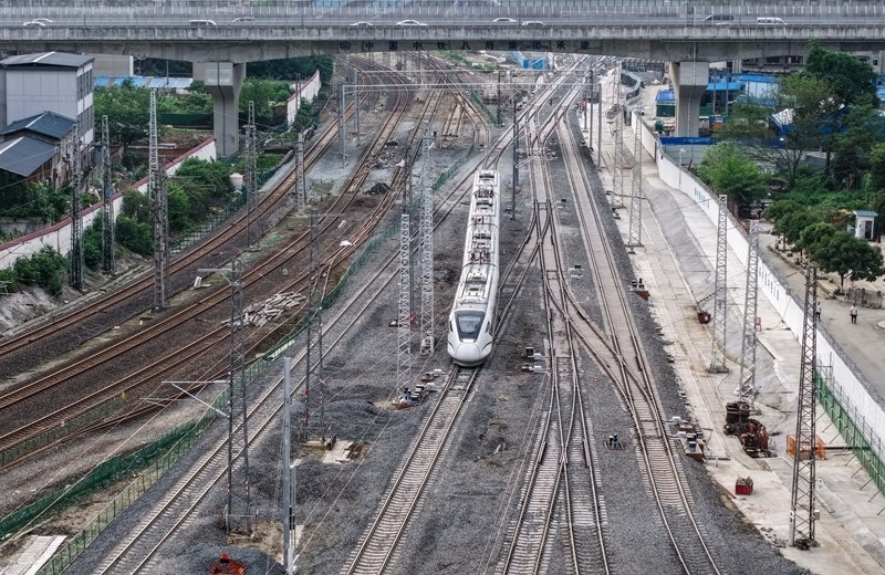 6月20日,成渝中線高鐵成都站南北站場交替施工完成后,一列列車順利通過成都站南站場(無人機(jī)拍攝)。
