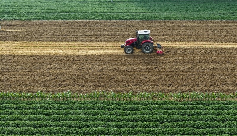 6月19日,河北省遵化市東新莊鎮(zhèn)農民駕駛農機旋耕土地(無人機照片)。