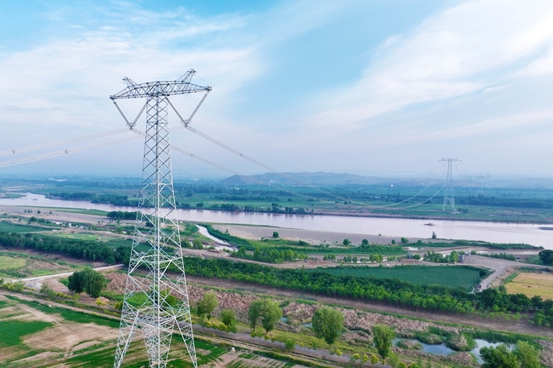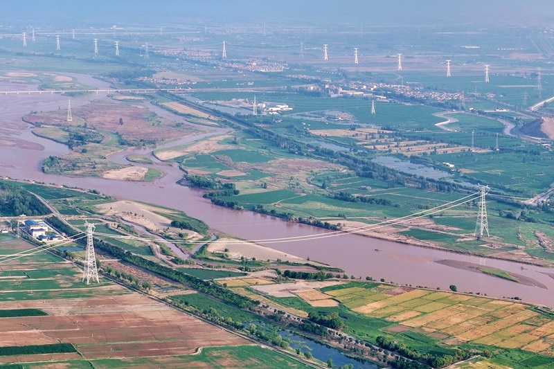 這是6月29日拍攝的“寧電入湘”工程寧夏中衛(wèi)市境內(nèi)跨黃河段線路(無(wú)人機(jī)照片)。