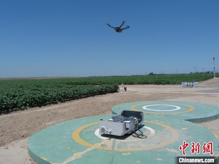 6月28日,新疆石河子市一片棉田中,遙感監(jiān)測作物長勢的無人機(jī)巡檢返回。 趙婧姝 攝