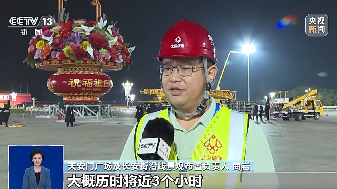 天安門廣場及長安街沿線景觀布置負責(zé)人 商巖:從吊裝準備工作開始,一直到吊裝完成,大概歷時將近3個小時。保證籃盤和籃體的緊密結(jié)合,因為花籃在插置的過程中有一個觀賞角度,所以在吊裝和合龍整個過程當(dāng)中,四面相應(yīng)的觀賞面都要有工作人員要盯著,這個面不能有任何的變化。