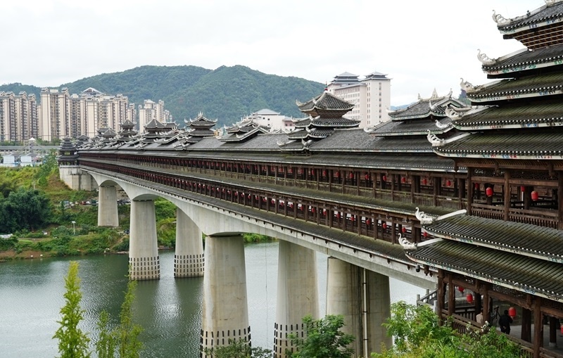 這是9月25日拍攝的三江侗族自治縣的程陽永濟(jì)橋。該橋建成于1924年,整座橋梁搭建時(shí)不用一釘一鉚,主要由木料和石料建成,橋長近80米,寬近4米,高近12米,是我國建筑藝術(shù)中的珍品。