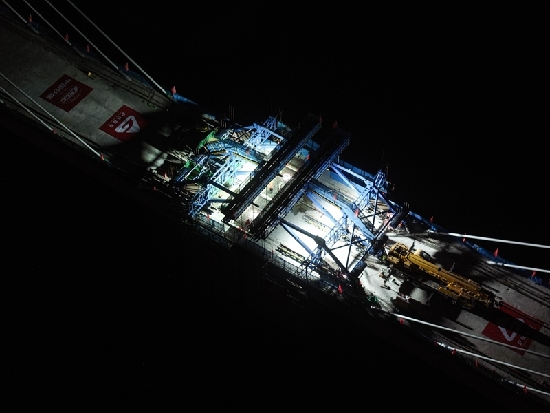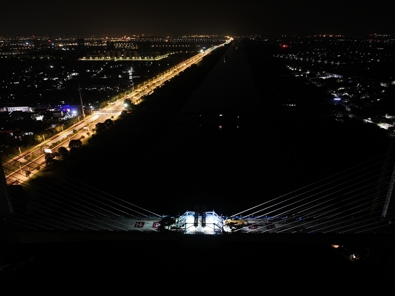 6月30日晚拍攝的滬渝蓉高鐵通泰揚(yáng)特大橋跨引江河斜拉橋施工現(xiàn)場(chǎng)(無人機(jī)照片)。