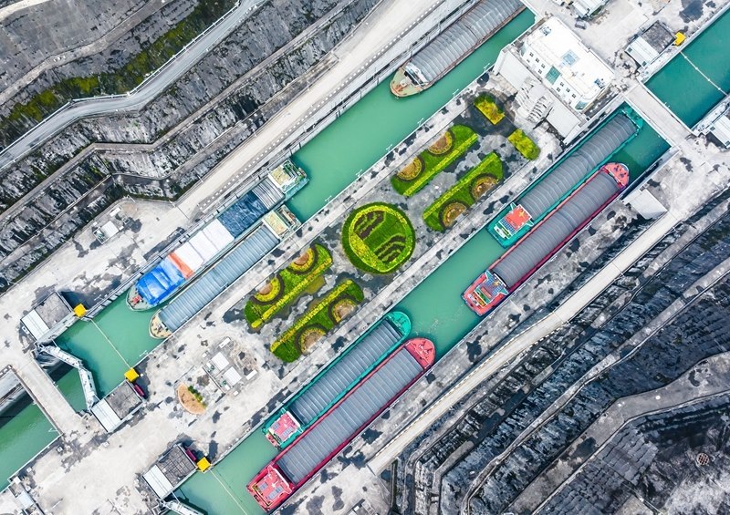 7月1日,在湖北宜昌,船舶有序通過三峽雙線五級船閘和升船機(無人機照片)。