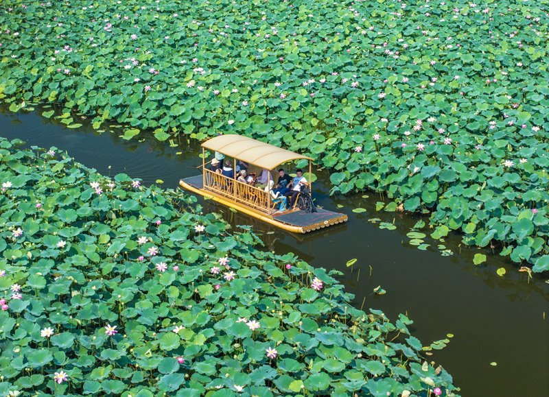 7月6日,游客在江蘇省興化市萬畝荷塘景區(qū)賞荷游玩(無人機照片)。