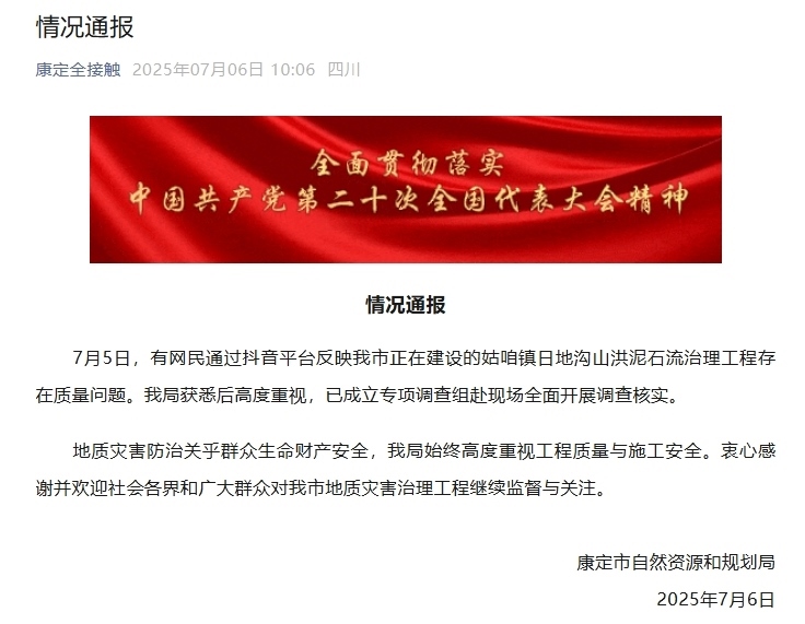 中新網(wǎng)7月6日電 據(jù)“康定全接觸”微信公眾號消息,7月5日,有網(wǎng)民通過抖音平臺反映四川省康定市正在建設(shè)的姑咱鎮(zhèn)日地溝山洪泥石流治理工程存在質(zhì)量問題??刀ㄊ凶匀毁Y源和規(guī)劃局獲悉后高度重視,已成立專項調(diào)查組赴現(xiàn)場全面開展調(diào)查核實。