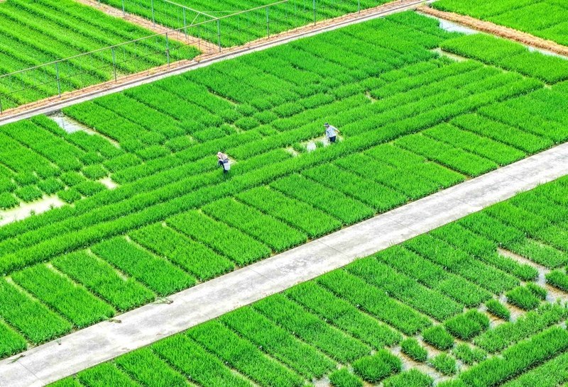7月7日,在江蘇里下河地區(qū)農(nóng)科所(揚州市農(nóng)科院),農(nóng)民在試驗田勞作(無人機照片)。
