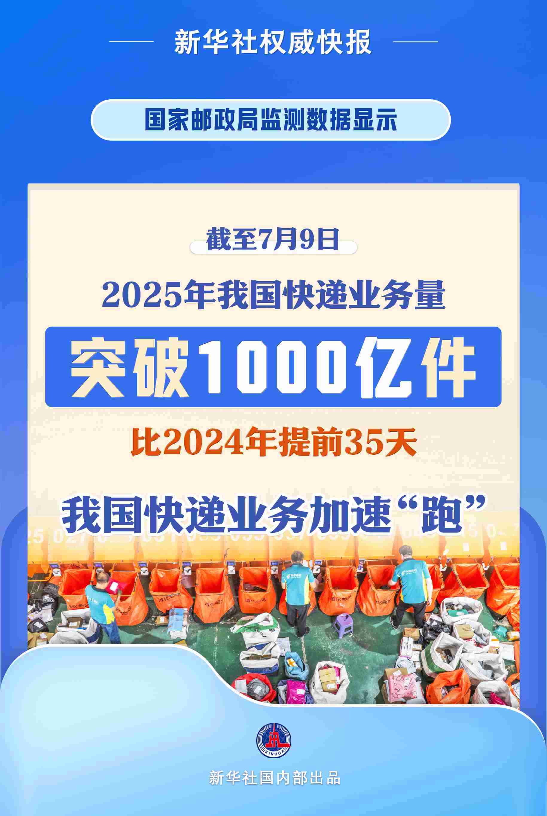 新華社北京7月10日電(記者葉昊鳴)記者10日從國家郵政局了解到,根據(jù)國家郵政局監(jiān)測數(shù)據(jù)顯示,截至7月9日,2025年我國快遞業(yè)務(wù)量突破1000億件,比2024年達到千億件提前35天。
