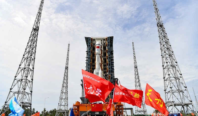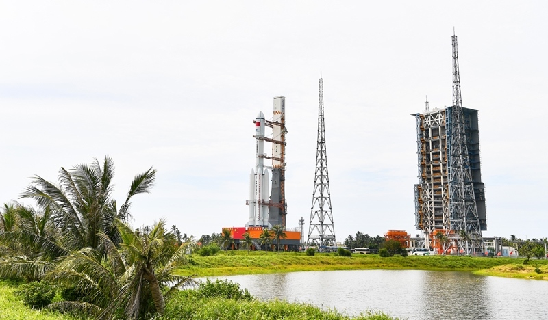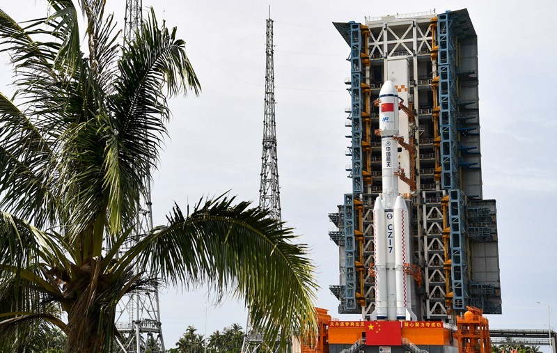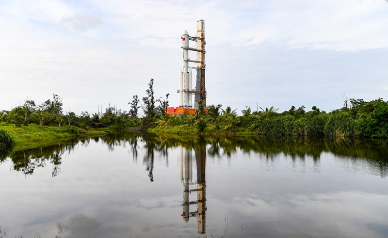 7月12日,天舟九號貨運(yùn)飛船與長征七號遙十運(yùn)載火箭組合體垂直轉(zhuǎn)運(yùn)中。