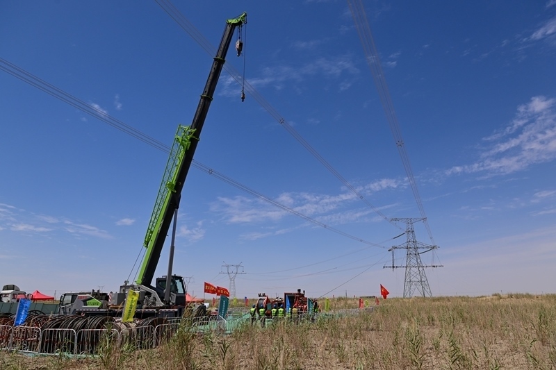 在民豐-且末750千伏線路,作業(yè)人員進行導(dǎo)線架設(shè)工作(7月11日攝)。