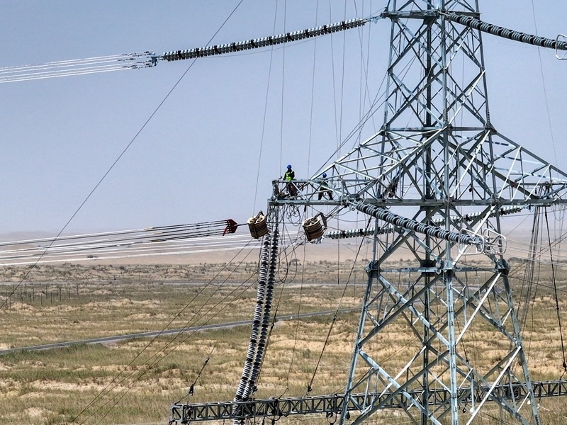 施工人員在且末-若羌750千伏線路開展走線消缺工作(6月24日攝)。