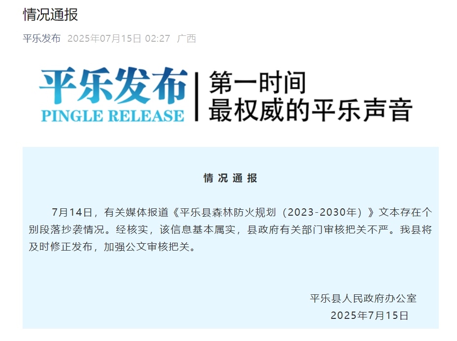 7月14日,有關(guān)媒體報道《平樂縣森林防火規(guī)劃(2023-2030年)》文本存在個別段落抄襲情況。經(jīng)核實,該信息基本屬實,縣政府有關(guān)部門審核把關(guān)不嚴。我縣將及時修正發(fā)布,加強公文審核把關(guān)。