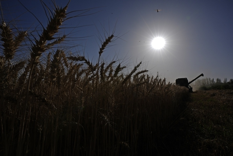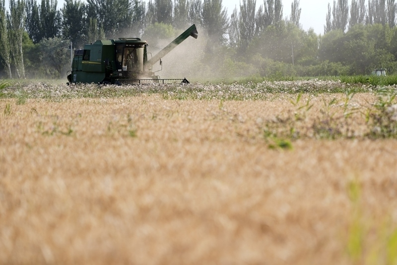 7月15日,收割機(jī)在銀川市賀蘭縣立崗鎮(zhèn)蘭星村收獲小麥。