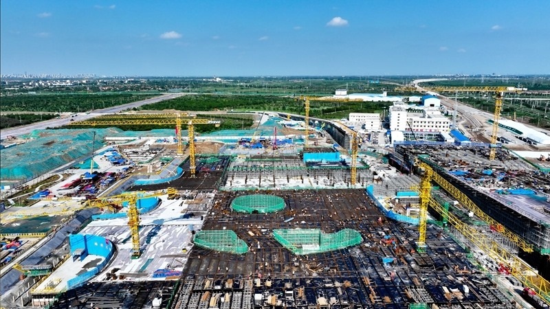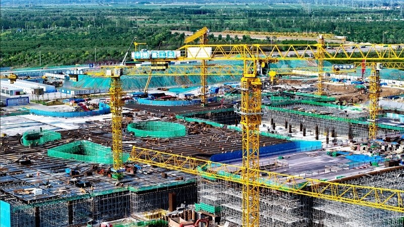 7月25日,在津濰高鐵山東東營高鐵站現(xiàn)代綜合客運(yùn)樞紐及配套工程建設(shè)現(xiàn)場,中鐵二十局工作人員在施工(無人機(jī)照片)。