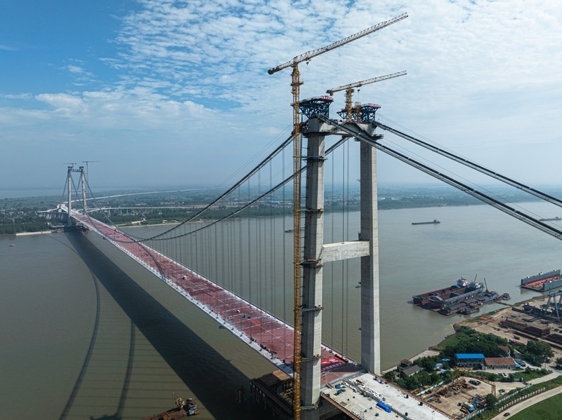 據(jù)了解,新港高速公路武漢雙柳長江大橋及接線工程是國家高速路網(wǎng)武漢都市圈環(huán)線重要組成部分,路線全長35.043公里,其中跨江主橋主跨1430米、寬50.5米,設(shè)計(jì)時(shí)速120公里,采用雙向8車道設(shè)計(jì),是目前長江上在建的最寬鋼箱梁懸索橋。