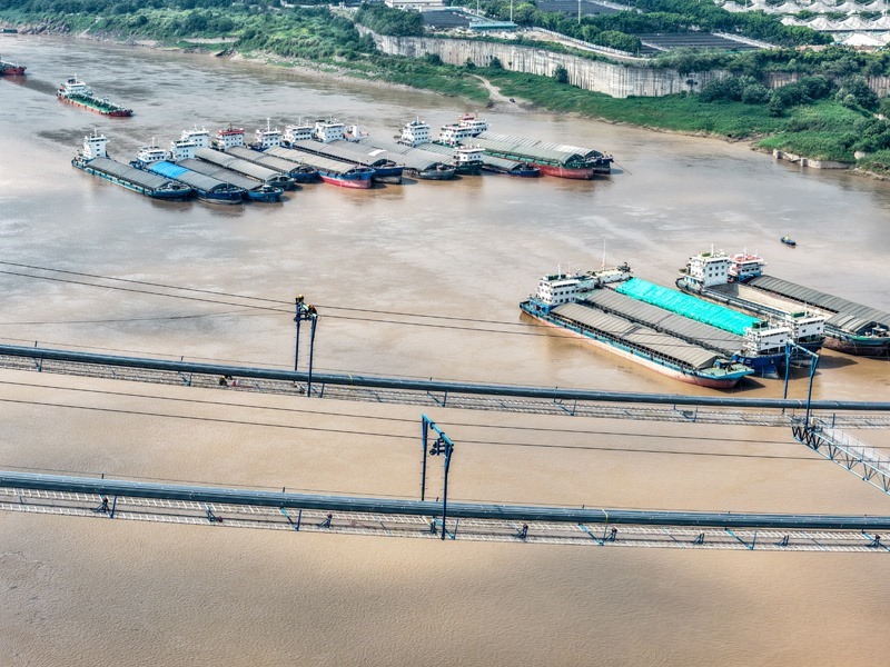 7月30日,在重慶黃桷沱長江大橋建設(shè)現(xiàn)場,工人在施工作業(yè)(無人機照片)。