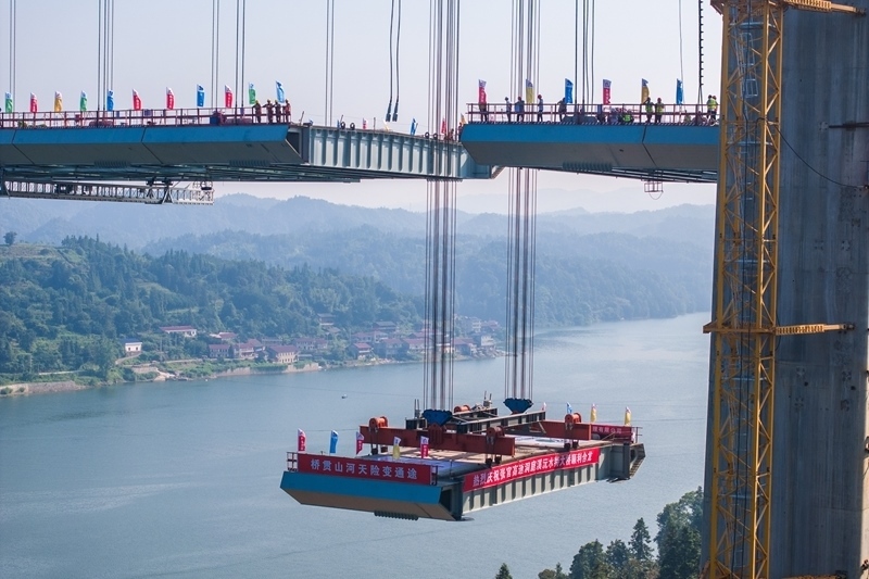 8月3日,在張官高速洞庭溪沅水特大橋施工現(xiàn)場,一塊鋼混結(jié)合梁在被緩緩提升(無人機(jī)照片)。