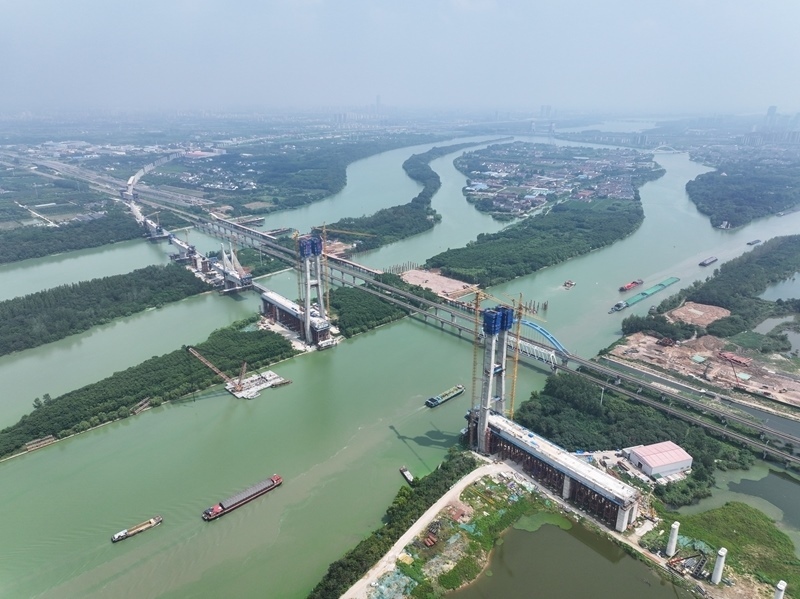 這是8月5日拍攝的滬渝蓉高鐵跨京杭運河斜拉橋建設現(xiàn)場(無人機照片)。