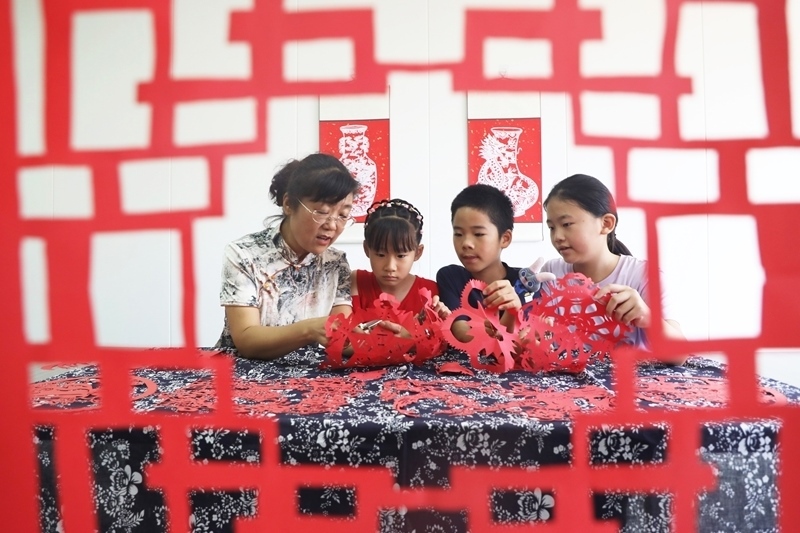8月9日,河北省唐山市豐潤區(qū)燕山路街道欣園社區(qū),小朋友在學(xué)習(xí)剪紙。