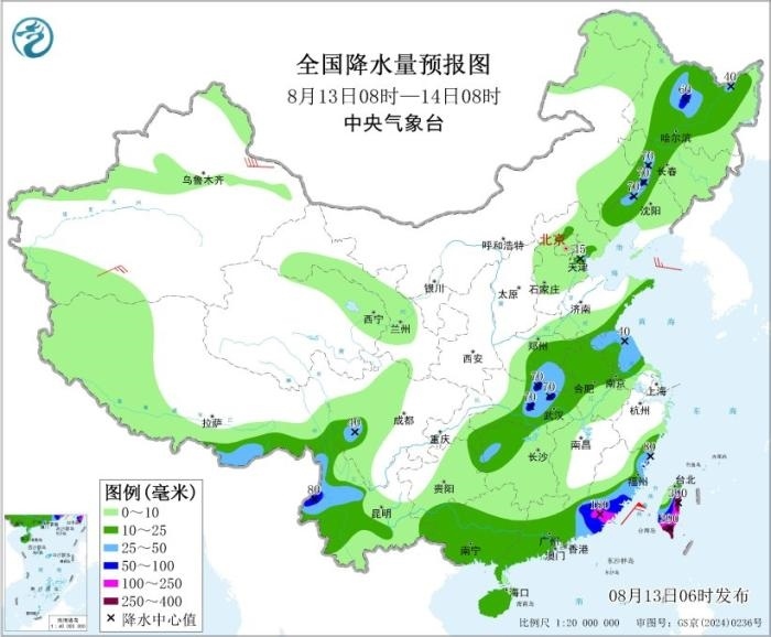 全國降水量預(yù)報圖(8月13日08時-14日08時) 圖片來源:中央氣象臺網(wǎng)站