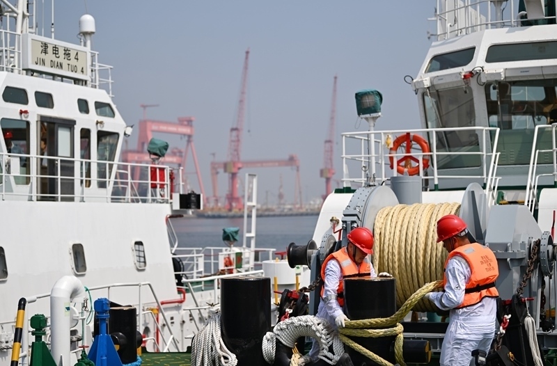 當(dāng)日,由4艘純電動(dòng)港作拖輪組成的“綠色艦隊(duì)”在中船天津碼頭鳴笛啟航。